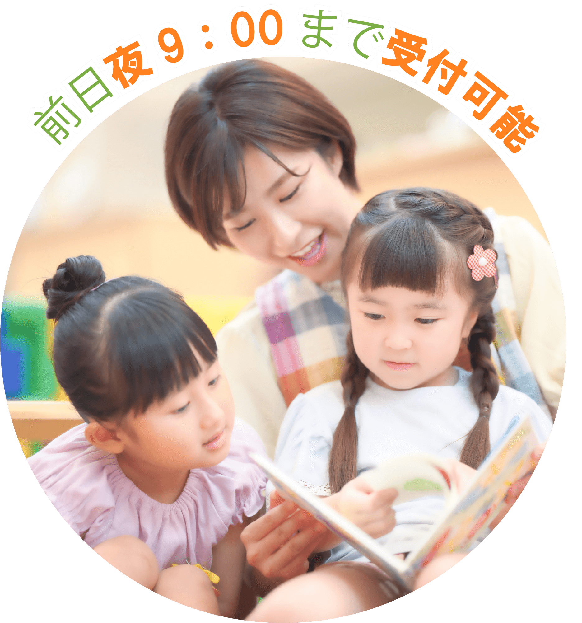 早朝保育:8:00からの利用が可能です夜間保育:20:00までの利用が可能です(スタッフの空き状況によってご利用いただけない場合があります。詳しくはお電話でお問い合わせください。)